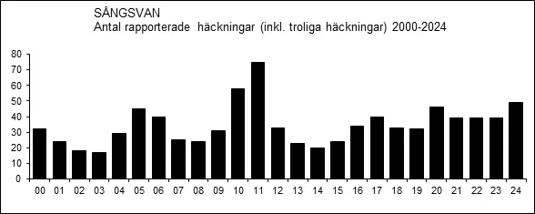 Inventeringsresultat från perioden 2000-2024 saknas, men som mest rapporterades spontant 75 häckningar år 2011 (FiV 43[2-3]:18).