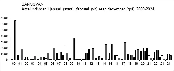 Från och med 1980-talet har vinterfynden (januari, februari, december) ökat kraftigt i antal. Sena höstar kan åtskilliga sångsvanar dröja sig kvar och som mest sågs drygt 6 000 fåglar i landskapet i december 2000. Å andra sidan kan tidiga vårar innebära att sångsvanar anländer i höga antal redan i februari, vilket var fallet t.ex. 2008 och 2014 med runt 2 500 fåglar på plats runt om i Västmanland de åren.